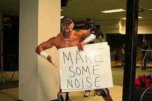 At World War 3 on November 23, 1997, Cain debuted under the ring name Lodi ("Idol" spelled backwards, which came about due to his perceived resemblance to rock musician Billy Idol).[3][7] Lodi was introduced as a member of Raven's Flock as an injury replacement for Stevie Richards.[2] He accompanied his fellow Flock members to ringside carrying a variety of signs,[2] which he displayed to the audience at intervals (a gimmick borrowed from ECW's Sign Guy Dudley).[8] The signs were generally intended to be humorous and variously furthered storylines, antagonized the audience, promoted the Flock, and made inside jokes aimed at other wrestlers or groupies. Cain made his in-ring debut on the December 8 episode of Nitro, losing to Chris Benoit.[2][9] Lodi disappeared from WCW television several months later after suffering a fractured ankle in a match against Psicosis. Upon his return, Lodi would become involved in the feud between Saturn and Raven. Lodi defeated Saturn in a match on WCW Thunder thanks to Kanyon, which then meant Saturn had to be Lodi's personal assistant till the PPV. After weeks of making a mockery of Saturn, The Flock disbanded at the September 13, 1998 Fall Brawl when Perry Saturn defeated Raven to win the freedom of the Flock.[1]