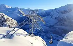 Loen Skylift is an aerial tramway in Loen in Stryn, Norway. The cable car climbs 1,011 metres (3,317 ft) to the top of Mount Hoven, above the Nordfjord. The maximum speed is 7 metres per second (23 ft/s).[1] With a gradient up to 60°, it is one of the steepest in the world.[2][3][4][5] The average is 45°. The gondola car is 170 metres (560 ft) above ground at the highest. It is the first aerial tramway installed in Norway since Hangursbanen in 1963.[6][2][3]
