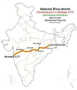 Lokmanya Tilak Terminus - Tatanagar Antyodaya Express is a superfast express train of the Indian Railways connecting Lokmanya Tilak Terminus in Maharashtra and Tatanagar Junction in Jharkhand. It is currently being operated with 22885/22886 train numbers on a weekly basis.