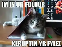 The syntax of lolcat captions was used as the basis for LOLCODE, an esoteric programming language with interpreters and compilers available in .NET Framework, Perl, etc.[1]