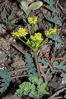 Lomatium martindalei is a species of flowering plant in the carrot family known by the common names Cascade desertparsley and coast range lomatium. It is native to the west coast of North America, from Vancouver Island south to the Klamath Mountains of far northern California. It can be found in a number of coastal and inland habitats, from coastal plains to high mountain talus and meadows. This is a perennial herb growing 15 to 40 centimeters tall from a carrot-like taproot. There is often no stem, the erect or spreading leaves and inflorescence emerging from ground level. The thinly fleshy leaves may approach 20 centimeters long, their blades divided into leaflets made up of many small oval segments. The inflorescence bears an umbel of small yellowish flowers.