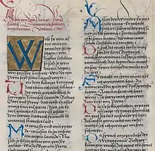 The term Lombardic comes from the study of incunabula.[4] A characteristic form of text decoration in manuscripts and early printed books with hand colouring was to use alternating red and blue Lombardic capitals for the start of each successive paragraph.[4][5] Unlike historiated or inhabited initials, Lombardic capitals are devoid of further decoration.[6]