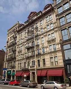 Among the distinctive elements of the Lombardy's architecture are plentiful pilasters with Corinthian-style capitals, an elaborate cornice and brackets, and multiple balconies of wrought iron.[2] Although the walls are primarily brick,[3] they are decorated with elements of sandstone,[4]: 7 along with limestone details and projections.[2]
