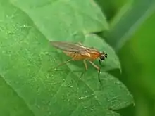 An adult Lonchoptera bifurcata is about 2-5mm (0.08-0.2in) long. In North America it can be distinguished from closely related species by having pale-coloured bristles behind the eyes, several bristles on the front of the tibiae of the first pair of legs (other species have a single bristle), and wings with fairly sharp points.[2] There are two colour phases, light tan and black. Dark phase individuals may have a completely dark abdomen or may have pale longitudinal markings on the abdomen.[3]