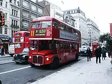 In May 1949, Leyland Titan RTW buses were introduced on route 11.[14] AEC Regent III RT buses were in service on route 11 in the 1950s.[15] On 12 June 1959, the fourth AEC Routemaster in passenger service (RM14), entered service on route 11 from Riverside garage.[16]
