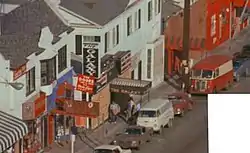 ![]() Screen capture from the film Mondo Bizarro (1966) of the Sunset Strip between Clark and Hilldale showing (from L-R), the Hamburger Hamlet, the London Fog (with a banner displaying the band's name clearly visible), Galaxy & Galaxy Overflow, and Whisky a Go Go. | |