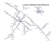 London Midland's services were divided between four groups of routes: London Euston Routes, Birmingham Regional, West Midlands Local and Branch Lines.[5][6]