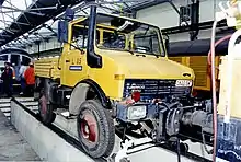In 1983 and 1986, London Underground purchased two Unimog road-rail vehicles, which were used as depot shunters. They are fitted with small railway wheels just outside the road tyres, which can be lowered when working in railway mode, and ensure that the road wheels run along the top of the rails. They are numbered L84 and L85.[21] They previously owned a Unimog tractor-trailer pair of vehicles, purchased in 1982, which were used for leaf-clearing duties. Nozzles on the tractor unit were used to suck up the leaves, which were then stored in a 570-cubic-foot (16 m3) bin mounted in the trailer.[11]