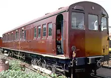 For the surface lines, two T Stock cars were converted into sleet locomotives in 1961. They were permanently coupled together, and never ran independently. The de-icing equipment was fitted to the inner motor bogies, rather than being carried by separate bogies as on the tube-sized sleet locomotives.[3] The cars were renumbered ESL118A and ESL118B, previously being 2758 and 2749 respectively.[5] The locomotives were part of a leaf clearing experiment between 1978 and 1979, when they were marshalled into a train containing a brake van, a flat car, and Metropolitan electric locomotive Sarah Siddons. The flat car had two 2,000-imperial-gallon (9,100 l) water tanks and a Merlin bus engine mounted on it, which was used to spray water at high pressure onto the running rails. L149, a ballast motor car, replaced the sleet locomotives in 1979. In 1980, the flat truck was coupled between ESL118A and ESL118B to form a leaf cleaning train, and the high-pressure sprays were augmented by a mixture of sand and chromium or stainless steel granules, which was applied to the rails in a gel to improve adhesion. The metal granules ensured that the track signalling circuits continued to operate.[3] After being withdrawn, both cars were preserved and are currently located at the Buckinghamshire Railway Centre, Quainton Road.