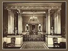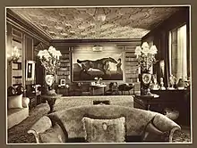 The tragedy of the sale of Londonderry House was not the comparatively meagre price (by current standards) it fetched for the Londonderry family, but the fact that this magnificent mansion was then immediately, apart from its stableyard (which still stands, with its separate entrance in Brick Street still surmounted by the coronet of a Marquess), completely demolished. The bland exterior of Londonderry House concealed, for example, the aforementioned magnificently painted, and fresco-ceiling interiors by James "Athenian" Stuart who had, coincidentally, built the Temple of the Winds at the Londonderry's Ulster seat of Mount Stewart. The main stairway was meant to outdo that of Lancaster House in nearby St James's.[1] It succeeded in this: it had a large skylight, Rococo chandelier and two individual flights of stairs flanking each other. This stairway led into the Grand Ballroom which, rather individually, held full-length portraits of the Stewart family men in Garter Robes, by artists such as Sir Thomas Lawrence (who painted the 2nd Marquess) and Glyn Philpot (who depicted the 7th Marquess). Said to have been inspired by the Waterloo Chamber of Apsley House, it also outdid that. Around the room were large marble statues including by Canova and chairs in the French style.