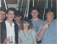 Lone Justice began as part of the L.A. cowpunk scene of the 1980s, inspired by Hedgecock and McKee's shared affection for rockabilly and country music.[2] The group started out as a strict cover band,[3] but after the additions of bassist David Harrington and drummer Don Willens,[4] they began to compose their own material.[3] Marvin Etzioni was initially brought in as producer, arranger and songwriter for the band, but ended up replacing Harrington as bassist in 1983.[4] By 1984, Don Heffington had replaced Willens as drummer.[2] Their early sound was a fusion of country music and punk rock with rockabilly elements, but by the time of their first album, the band had begun to incorporate elements of roots rock and singer-songwriter styles. Benmont Tench of Tom Petty and the Heartbreakers was a frequent guest musician at their live shows. The band earned early support from Dolly Parton, who attended one of their club shows and later recalled McKee as "The greatest girl singer any band could ever have."[5]