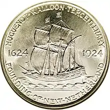 The reverse depicts a Dutch three-masted ship sailing to the right.[18] The design resembles the depiction of Henry Hudson's ship Halve Maen on the 1935 Hudson Sesquicentennial half dollar but is more stylized.[27] In the waves the ship rides over is the text, IN GOD WE TRUST, with the name of the country and the denomination of the coin surrounding the scene, together with the legend, LONG ISLAND TERCENTENARY.[31]
