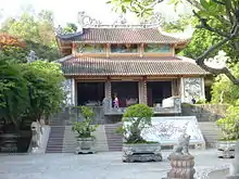 In 1900, after a large cyclone, the temple was destroyed and had to be moved from the hill to its current location. In 1936, the Buddhist Studies Association made the temple the headquarters of the Buddhist Association in Khánh Hòa Province. In 1940, the temple was renovated and expanded under the leadership of Thích Tôn Thất Quyền and a lay Buddhist by the named of Võ Đình Thụy. In 1968, the temple was heavily damaged during the Vietnam War, in particular the tiled roof. In 1971, Thích Thiện Bình organised for the capital works program to restore the temple, which was around 60% complete in accordance with the plans of the architect Võ Đình Diệp when it was interrupted by the Fall of Saigon and the communist victory over South Vietnam.[1]