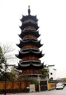 Longhua Pagoda is composed of wood and brick, and is built in the style of a pavilion. The pagoda consists of seven octagonal levels totaling a height of 40.64 meters.[note 2] Its core is hollow and tube-like, and its outer form is octagonal. The interior of the first story is octagonal, and the interiors of the other stories are square.[4] The stories decrease in size from the bottom to the top.[6] Each story contains four doorways and four rectangular shrines, but the shrines do not contain statues of Buddhas.[8] The positions of these doorways and shrines rotate by 45° on each story.[4] The floors of each story constitute the wooden structure. There are also wooden stairs which provide access to the seventh story. Under each floor there is a hidden brick post, and an entasis at the top of each post which splits into three sections. The corner bracket sets on the outer eaves are built in the “yuangyuang jiaoshou” style, which is typical of the Song Dynasty. On the sixth story is the pagoda’s 18-meter-long central pillar, which connects directly to the finial.[6] The ground floor peridrome stoa’s column head is spindle-shaped. There are fifteen decorative features on the square column, seven of which are wooden and eight of which are white. The bottom of the square column is in the shape of a zither’s surface. The railings on each level are in the shape of swastikas, and small bells are hung on the upturned corners of the outer eaves.[8]