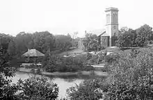 A footbridge at Carlton Street – one of the only steel bridges in an Olmsted-designed park, though it was designed and built by Brookline's town engineer – was added by the town in mid-1894 to provide access to the Riverway Park. The bridge was closed in 1975 due to severe corrosion.[9][10] Plans to repair and reopen the footbridge proved locally controversial for a number of years.[11] As of December 2019, construction of the $4 million project is expected to last from 2020 to 2022.[12]