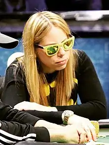 Harwood won two World Series of Poker circuit rings in 2012: 2012 WSOP Circuit - Palm Beach Kennel Club 500-entrant $300 + $45 buy-in No-Limit Hold'em Event 2 for $30,994,[4] and 2012 WSOP Circuit - Harrah's New Orleans 345-entrant $355 buy-in No-Limit Hold'em Event 4 for $23,090.[5] The former was her first ever WSOP Circuit event.[3] She earned her first bracelet by winning the 2,541-entrant $1,500 No Limit Hold'em 2013 World Series of Poker Event 60 and its $609,017 prize.[2] Her victory at the 2013 World Series of Poker was historic: it made her the second woman (Cyndy Violette, 2005)[6] to make three final tables in a single World Series and the first to win a bracelet in the same year she did so; it moved her into third place in the 2013 World Series of Poker Player of the Year race; and it moved her into eighth place on the all-time female World Series earnings list.[2] Additionally, her $609,017 is the highest payout to a woman in any Las Vegas event in World Series of Poker history (second in overall World Series of Poker Europe history to Annette Obrestad's £1,000,000 from the 2007 World Series of Poker Europe main event) and her $874,698 total at the 2013 World Series of Poker is the highest female total in a single World Series.[6]