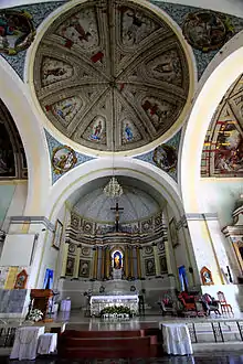 Inside the church, the narthex with azulejos flooring had a ceiling painting known as "The Entry into Jerusalem".[6] The baptistry and a wooden stairway to the choir loft and bell tower was located on the left and right sides of the narthex respectively.[8][9] Connecting the narthex and the nave are the pilasters in the arcade.[10] Adorning the church are paintings on its ceiling and walls, with garlands and medallions on its arches and pillars. Traces of paintings of yellow flowers on a blue background are credited to folk artists while murals in the ceilings are by Ray Francia. One of Francia's works is the painting of "Finding of Jesus in the Temple" in the epistle transept.[10]