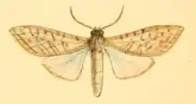 Primaries above semitransparent whitey brown, crossed by wavy grey lines much as in the preceding species, but with no oblique central line; a more or less marked blackish spot at the inferior extremity of the cell; secondaries hyaline white; thorax brown, abdomen creamy white; primaries below less strongly marked than above; body sordid white: expanse, M 1 inch 2 lines; F 1 inch 4 lines.[2]