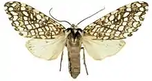 The length of the forewings is about 25 mm. The ground colour is light beige, largely speckled with brown and ornamented with bands of white rounded spots underlined with brown. The basal band formed by a unique spot on the costa. The postbasal, antemedian, median, postmedian and subterminal bands are formed by an alignment of white spots underlined with brown and intercalating between veins. The postbasal band is broken. The antemedian is formed by two white spots and two brown spots. The median band is formed by two spots on the reniform spot. The postmedian is almost straight and complete. The terminal band is formed by irregular white spots sometimes fused with the sinuous subterminal spots. The hindwing is white and semi-translucent. The anal margin is more densely scaled with brown scales. The fringe is checkered white and brownish.