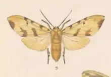 Primaries pale brownish yellow, with a small orange coloured spot close to the base, three large spots along the costal margin, a large elongated patch on the outer margin, and two rather broad streaks on the inner margin partly crossing the wing towards the middle, all pale brown. Secondaries pale yellowish white, partly hyaline (glass like) near the base. The underside of the primaries as above, but with all the markings more indistinct. The head and thorax the same colour as the primaries; the abdomen above orange, the anus and the underside whitish; the legs and antennas orange brown. Wingspan 2+1⁄4 inches (57 mm).[2]