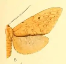 Body chrome yellow, the patagia, inwardly shaded with brown. Primaries acute with outer margin straight and oblique; yellow, the inner margin dark brown; fine wavy brown lines cross the wings, very indistinct at the base; the outer and submarginal lines double, filled in with a slightly darker shade than the ground color and the submarginal line ceases at vein 5; a terminal row of darker spots edged with brownish between the veins; a dark spot at the end of the cell. Secondaries whitish yellow. Expanse, 52 mm.[2]