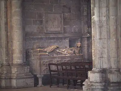 Lopo Fernandes Pacheco died on 22 December 1349 and was buried in Lisbon Cathedral, also the final resting place of King Alfonso IV. His sarcophagus, one of the most beautiful ones in the cathedral, is in the Chapel of Saint Cosme and Saint Damian. The most relevant events of his life and his marriage were engraved on a stone slab, commissioned by King Afonso IV, which was placed on the wall above his sarcophagus.[14]
