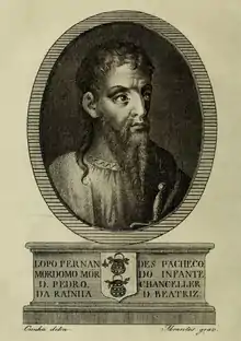 The rise of his lineage in the Kingdom of Portugal, a process by which members of the lower nobility gradually displaced the old lineages, began with Lopo Fernandes Pacheco, the first Lord of Ferreira de Aves.[4] A great favorite of the monarch, he was perhaps one of the most prominent personalities during the reign of Afonso IV of Portugal.[5] He occupied several posts in the kingdom: merino-mor (1329);[6] mordomo-mor of Infante Pedro, the future King Pedro I of Portugal; and, member of the king's council.[7] He was also the mordomo-mor (1334-1336) and chancellor (1349) of Queen Beatrice of Castile,[8] the wife of King Afonso IV, and, in 1327 was one of the executors of the will of Queen Elizabeth of Aragon, the wife of King Denis of Portugal.[9][7] King Afonso IV entrusted Lopo with the education of his children, the infantes Peter and Eleanor,[10] the future queen of Aragon by her marriage to King Peter IV.