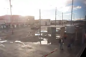 ![]() Lordsburg station, with a simple metal shelter and passengers boarding from the paved vehicle crossing | |||||||||||||||