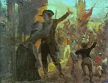 During the so-called 1849 Imperial Constitution campaign, Cantador once again came into the public eye. At the beginning of these riots, on 7 May 1849, the president of the government had again imposed a state of siege on Düsseldorf. On 9 May 1849, the doctor Peter Joseph Neunzig called for open resistance against the Prussian military from Cantador's house on Marktplatz[17] and to support a "provisional government of the Rhenish Republic" founded in Elberfeld (→ Elberfeld uprising).[18] Cantodor did not let Ninety finish his speech, but pushed him away from the window of his house. Until the morning of the following day, bloody barricade fights occurred between members of the vigilantes and Prussian military, resulting in 16 deaths,[19] among them the young painter Ludwig von Milewski. Cantador immediately fled to avoid arrest again.
