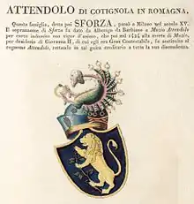 Lorenzo was probably son of Nascimbene.[1] He was the cousin of Giacomo Attendolo, and they were at the service of the House of Este.[1] In 1412 a great fire was recorded in Cotignola which destroyed everything, with the exception of the church, the house of Sforza and the house of Lorenzo Attendolo.[2] In 1427 was part of Duchy of Milan as a soldier and later on with Francesco Sforza.[1] In his last military action commanded the troop of the king of Naples Alfonso V of Aragon.[1]