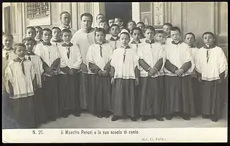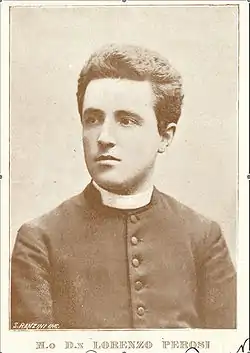 Monsignor Lorenzo Perosi (21 December 1872 – 12 October 1956) was an Italian composer of sacred music and the only member of the Giovane Scuola who did not write opera. In the late 1890s, while he was still only in his twenties, Perosi was an internationally celebrated composer of sacred music, especially large-scale oratorios. Nobel Prize winner Romain Rolland wrote, "It's not easy to give you an exact idea of how popular Lorenzo Perosi is in his native country."[1] Perosi's fame was not restricted to Europe. A 19 March 1899 New York Times article entitled "The Genius of Don Perosi" began, "The great and ever-increasing success which has greeted the four new oratorios of Don Lorenzo Perosi has placed this young priest-composer on a pedestal of fame which can only be compared with that which has been accorded of late years to the idolized Pietro Mascagni by his fellow-countrymen." Gianandrea Gavazzeni made the same comparison: "The sudden clamors of applause, at the end of the [19th] century, were just like those a decade earlier for Mascagni."[2] Perosi worked for five Popes, including Pope Pius X who greatly fostered his rise.