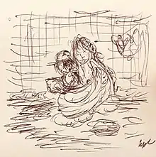 The Goodbye family consisted of undertakers Otis and Pyridine, their daughter Orphie and her pet tarantula Dorian. Orphie was first seen atop the Notre Dame Cathedral with gargoyles, Otis was trying to board a train at customs with a shrunken head, Pyridine was sewing a limb back together in Cardiff, and Dorian was capturing a fairy to eat. Following these illustrations, a cat Ouiji was unveiled and Orphie is said to have a brother named Kepla, but he is hardly ever seen and it is unclear if he even exists."[26]