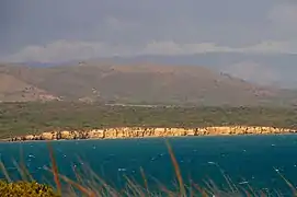 Los Morrillos de los Cabos Rojos (Spanish for "the little promontories of the red capes") or more commonly known as Los Morrillos de Cabo Rojo, is a cape and tombolo landform located in southwestern Puerto Rico in the municipality of Cabo Rojo. Los Morrillos is an excellent example of a tombolo, or a tied island, with two sand pits. The cape resembles a letter Y with its two promontories or morrillos being connected through sand pits which enclose a saltwater lagoon. The landform was designated a National Natural Landmark in 1980 (as the Cabo Rojo National Natural Landmark), and the site includes mangroves, beaches, important bird nesting areas, limestone caves, cliffs and rock formations.[1] The reddish-colored limestone cliffs give the name to the town and municipality of Cabo Rojo.[2]