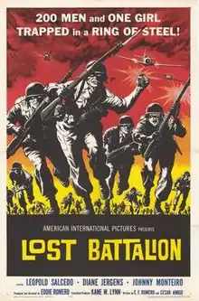 Lost Battalion (aka Escape to Paradise) is a 1960 black-and-white Filipino war film and love story produced and directed by Eddie Romero, and co-produced by Romero and Kane W. Lynn.[3] Set during World War II, it stars Leopoldo Salcedo, Johnny Monteiro and Diane Jergens. It was later released in the US by American International Pictures as Lost Battalion, on a double feature with Guns of the Black Witch in 1962. The film's ad line read "200 Men and One Girl Trapped in a Ring of Steel!"[4]