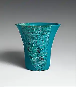 The Lotiform Chalice (c. 945–664 B.C.) is faience relief chalice. Images carved into the chalice depict fish, papyrus clumps, and lotus blooms. The vessel's images possibly portray legends surrounding the flooding of the Nile, an event that was of significant economic and spiritual importance to the ancient Egyptians.[1][5]