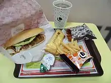 Its menu includes typical fast-food items such as burgers, french fries, fried chicken, chicken wings and chicken fingers.