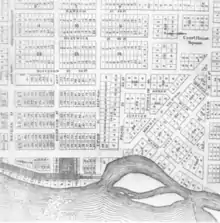 In 1831, a federal survey was performed of the Northwest Territory and land was offered for sale. Campau bought 72 acres around his trading post and near the Baptist mission for $90 on September 19 of that year. Living at the post were his wife and several members of his family.[6] Some of his brothers and nephews followed him to Grand Rapids.[2] One year later, government surveyor Lucius Lyon purchased land north of Campau's property. Campau surveyed and platted the village following Native American trails.[6] Lyon had platted his property in an English grid format, which meant that there were two adjoining villages, with different platting formats. Campau had formatted his village streets with a row of 16 abutting row houses on Pearl Street that bordered Lyon's village, which made travel through the two villages cumbersome. Travelers had to go north to Division Street to cross into Campau's village.[6]