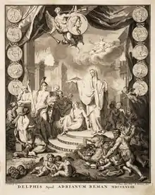 His parents Jean du Bourg(h) and Elisabeth Burlamacchi married in 1681. Louis Fabrice was baptized on 5 July 1693 in the Walloon church. He was a pupil of Gerard de Lairesse, Gerrit Rademaker (1672-1711) and Jacob van Huysum. In 1718 he became sexton of a small wooden church on Kerkstraat.[1] Around 1726 he was practising foreshortening and may have been a member of an academy; he produced a lot of nude (art) during his life.[2] When he married Eva de Kaarsgieter in 1729 he cooperated with Bernard Picart.[3][4] After producing several beautiful pictures, some of which may be seen at the Westerkerk, the New Church and town hall of Amsterdam, he exchanged the brush for the graver, and executed some vignettes and other small compositions, and also etched a number of plates from his own designs.