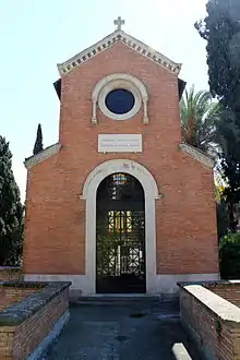 Finally, in 1913, John Hasslocher and his sister, Anna Ehret, financed the construction and adornment of the American College's current Romanesque mausoleum in Campo Verano.[20] Upon the completion of that structure the remains of Monsignor Hostlot and most of the other deceased of the College were transferred to the new mausoleum, where they rest today.[20] The following inscription was erected in the chapel to commemorate Louis Hostlot and record the funerary chapel's donation by his family:
