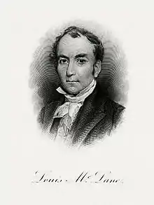 Louis McLane (May 28, 1786 – October 7, 1857) was an American lawyer and politician from Wilmington, in New Castle County, Delaware, and Baltimore, Maryland. He was a veteran of the War of 1812, a member of the Federalist Party and later the Democratic Party. He served as the U.S. representative from Delaware, U.S. senator from Delaware, U.S. Secretary of the Treasury, U.S. Secretary of State, Minister Plenipotentiary to the United Kingdom, and president of the Baltimore and Ohio Railroad. As a member of President Andrew Jackson's Cabinet, McLane was a prominent figure during the Bank War. McLane pursued a more moderate approach towards the Second Bank of the United States than the President, but agreed with Jackson's decision in 1832 to veto a Congressional bill renewing the Bank's charter. He also helped draft the Force Bill in 1833. He was elected to the American Philosophical Society in 1831.[1]