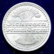 Reverse of the first coin of the Weimar Republic. Design by Louis Oppenheim.