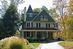 Three stories tall, the Sawyer House consists of shingled walls built on a stone foundation and covered with an asphalt roof. Among its features is a tower on one corner; it extends through all three stories, and it is topped with a steep roof rising to a point. Numerous shuttered windows occupy much of the wall area, including some window space in the front gable.[2] The main entrance is located on the right side of the facade, across from the tower; deeply recessed, it is framed with sidelights and a pair of columns. Extending across the entire facade, including the base of the tower, is a veranda-style porch with Ionic columns. All of these features combine to make it one of metro Cincinnati's best examples of the Shingle variant of the Queen Anne style of architecture. Virtually no changes have been made to the house's exterior since it was built, making it an exceptionally well preserved example of the style. Another such house, the Josiah Kirby House, is located in the same Wyoming neighborhood, but its substantially larger size makes it a mansion, unlike the smaller Sawyer House.[3]