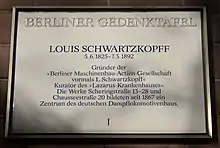 Schwartzkopff was curator of the Lazarus Hospital. Schwartzkopffstrasse in Berlin-Mitte was named in his honour on 12 March 1889.