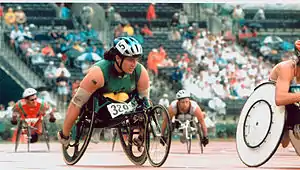 From 1993 to 2001, Sauvage won every IAAF wheelchair demonstration event at IAAF World Athletics Championships.[22] In that same period, she also won the demonstration events for wheelchair racing in the 800 meter race at the Olympic games.[23] The 800 meter event does not require that athletes stay in their lanes after the first turn. For this reason, athletes like Sauvage are required to wear helmets when racing. In 2000, Sauvage won the Olympic demonstration event and was expected to win the Paralympic gold. She was upset by Canadian Chantal Petitclerc.[23] The Australian delegation appealed the result, claiming the race was not fair because another racer, Ireland's Patrice Dockery, was disqualified for leaving her lane too early. The appeal was rejected, because Dockery was too far behind the front runners to impact the results. Sport academics who research the Paralympic Games consider this protest to be pivotal, because it shows the passion of athletes to win and the extent that sports people will go to claim gold. It also highlighted that the rivalries in the sport were real. Petitclerc said of her rivalry with Sauvage that "I dream more about Louise than I do my boyfriend." In 2002, Petitclerc beat Sauvage again at the 2002 Commonwealth Games, where the 800 meter event was a full medal event at the games for the first time. It was only the second time that Sauvage had lost to Petitclerc.[24]