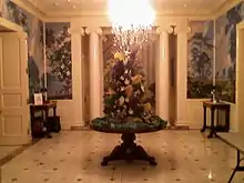 Inside, the floor plan includes twelve bedrooms and eighteen baths, two kitchens and one kitchenette, two dining rooms, one breakfast room, a receiving room for state affairs and another for routine business, a living room, a sitting room, two butleries and two security stations for the state troopers assigned to the mansion, and two offices-one for the governor and one for a secretary. Along with the dramatic spiral stairway in the rotunda, there is an elevator running from the basement to the third floor, as well as a system of dumbwaiters. These are wise amenities, considering the size of the house: altogether, the mansion comprises some twenty-five thousand square feet, serviced by a ninety ton cooling system to battle Louisiana's oppressive summer weather.[2] The main foyer at the mansion features a mural that depicts various aspects of Louisiana History as well as symbolic references to many past Louisiana Governors. This mural was originally painted in the year 2000 under the administration of Governor Mike Foster. It was most recently updated with symbolic references relating to Hurricane Katrina and then Governor Kathleen Blanco.