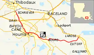 Continuing through East Houma, LA 24 bends to the southeast with Bayou Terrebonne. An intersection with LA 3087 (Prospect Boulevard) provides a connection with LA 182 north of the city. While passing alongside the Houma-Terrebonne Airport, LA 24 begins to follow Bayou Petit Caillou, which branches off of Bayou Terrebonne. In an area known as Presquille, LA 56 picks up this route, while LA 24 makes a zigzag across both Bayous Petit Caillou and Terrebonne, exiting the Houma city limits, to assume the path of LA 659. Passing through the community of Bourg, LA 24 intersects LA 316 and crosses another lift bridge over the Company Canal. Shortly afterward, LA 24 turns northeast away from Bayou Terrebonne at Klondyke while LA 55 assumes the route southeast toward Montegut. LA 24 then curves eastward again and crosses from Terrebonne Parish into Lafourche Parish.[2][3][4]