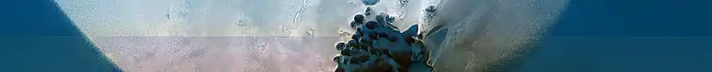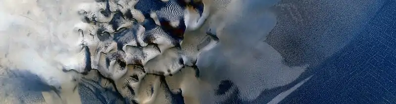 The ice mound is divided into four feature types: smooth interior ice, irregular "trough-bearing" ice, sand dunes, and "stucco" rough ice.[4] One feature of the central mound are elongate features interpreted to be sastrugi, that being windswept ice mound and groove features. Unlike sand dunes, whose ridges are perpendicular to the direction of the wind, the ridges of sastrugi are parallel.[4][11] The variation in albedo featured by the aforementioned sastrugi that was observed by Brown et al. was not understood at this point.[4] Another feature of the central mound is that of a cluster of dark sand dunes at the edge of the deposit, water ice was found to have deposited likely after the formation of the dunes. The formation of the dune system is not fully understood, and multiple theories exist for their formation. This includes their formation prior to the ice mound's creation,[5] their formation after the ice mound and the ice found on the dunes is simply frost, or the dunes are a product of material left behind after another material sublimated.[4] It was later found that ice mound exchanges water ice from the surrounding regolith.[11] Ice that was described as resembling stucco was thought to be the youngest portion of the water ice mound. Arcuate features within the stucco ice is thought to represent the growth of the ice mound, similar to other features known as north polar layered deposits (NPLD) found in other Martian craters.[4] The northern border of the ice mound is abrupt in its transition to the regolith, the southern border in comparison, is diffuse.[8] Anomalous "defrosting spots" that persist into the summer are present in Louth, akin to features in other Martian polar regions, the features, which resemble dark smudges, are not fully explained.[16]