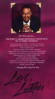 Love, Luther is a four disc box set chronicling the musical career highlights of Luther Vandross. Promoted by the single "There’s Only You," the set includes unreleased demos, full-length album versions of Vandross' hit songs, and several of his productions for other artists.