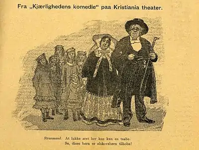 Love's Comedy (Norwegian: Kjærlighedens Komedie) is a comedy by Henrik Ibsen. It was first published on 31 December 1862.[1] As a result of being branded an "immoral" work in the press, the Christiania Theatre would not dare to stage it at first.[2] "The play aroused a storm of hostility," Ibsen wrote in its preface three years later, "more violent and more widespread than most books could boast of having evoked in a community the vast majority of whose members commonly regard matters of literature as being of small concern."[3] The only person who approved of it at the time, Ibsen later said, was his wife.[4] He revised the play in 1866, in preparation for its publication "as a Christmas book," as he put it. His decision to make it more appealing to Danish readers by removing many of its specifically Norwegian words has been taken as an early instance of the expression of his contempt for the contemporary Norwegian campaign to purge the language of its foreign influences.[5]