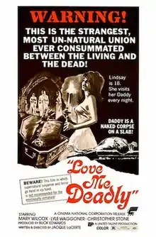 Love Me Deadly is a 1972 American horror film directed by Jacques Lacerte and starring Mary Charlotte Wilcox, Lyle Waggoner, and Christopher Stone. The screenplay concerns a coven of devil-worshipping necrophiles that moves to Los Angeles and sets up their base of operations out of a funeral home.
